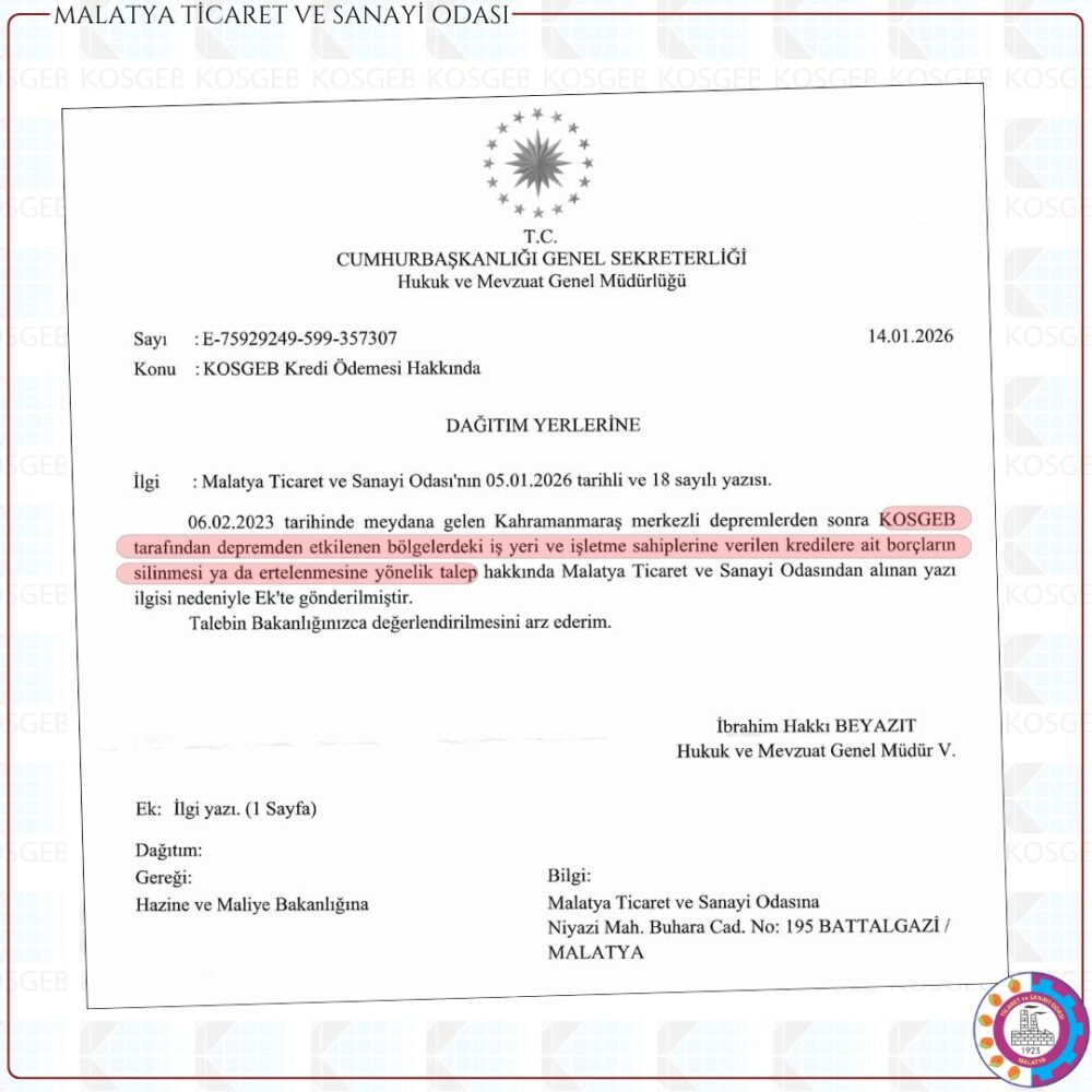 Malatya Ticaret ve Sanayi Odası’nın, deprem bölgesindeki işletmeler için KOSGEB kredi borçlarının silinmesi veya ertelenmesine yönelik talebi, Cumhurbaşkanlığı tarafından Hazine ve Maliye Bakanlığı’na değerlendirilmek üzere iletildi.
