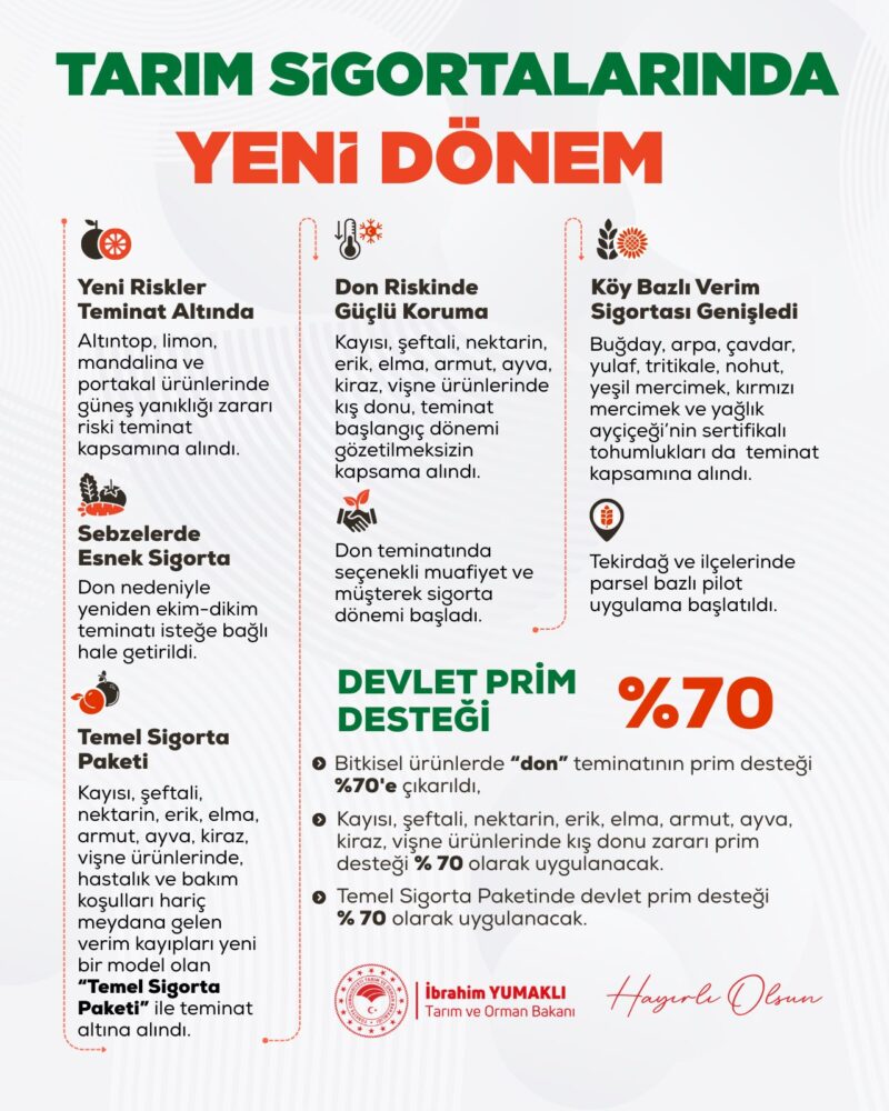 Tarım ve Orman Bakanı İbrahim Yumaklı, tarım sigortalarında kapsamın genişletildiğini, don teminatı ve Temel Sigorta Paketi için devlet prim desteğinin yüzde 70’e çıkarıldığını açıkladı.